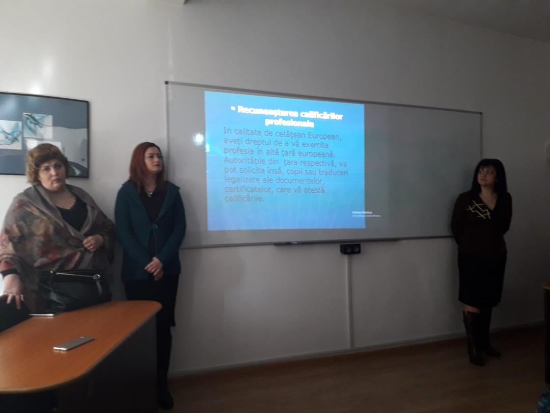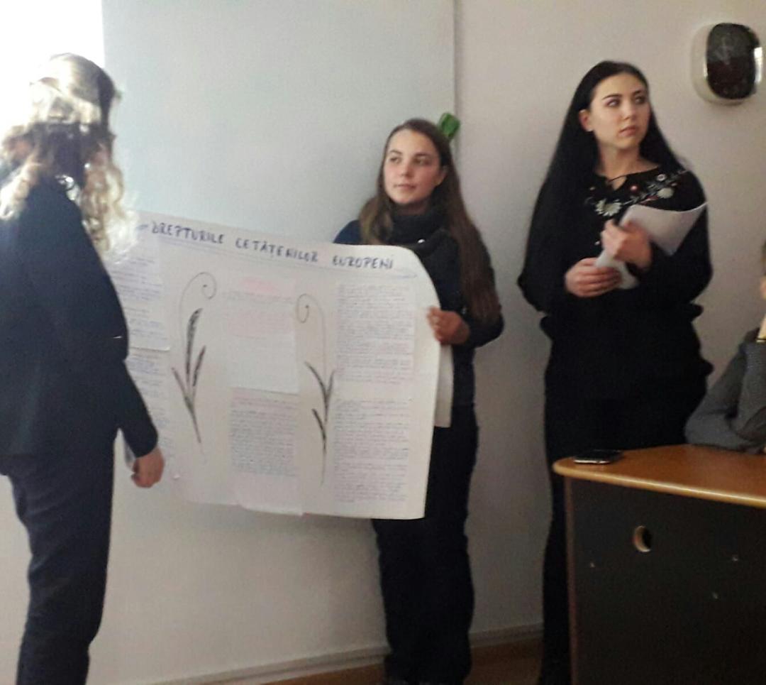 La activitatea ”Drepturile și obligațiile cetățenilor europeni”, desfășurată în data 19 februarie 2019, elevii: Botezatu Alina Florentina, Federovici Denisa Ionela, Lupan Petronela, Petrea Ioana, Daniliuc Bianca Elena, Matrași Antonia, Dumbravă Eduard Constantin, Carpiuc Liviu, Pintilie Lucian Mihai, Drăgoi Ionuț Eusebiu, Stoian Cosmin Gabriel, Boicu Florin Ionuț, Apostol Petru Daniel au pregătit și prezentat eseuri, planșe și scurte informări, care au fost urmate de o dezbatere liberă despre modul în care tinerii consideră că le sunt respectate drepturile, în România și în UE, organizată cu sprijinul coordonatorilor proiectului: Pr. Prof. Dr. Daniel Dascălu, Prof. Dr. Macovei Ada Alexandrina, Prof. Jeanina Cătălina Apostol și a colegilor: Prof. Crina Ștefan, Prof. Corina Țifrea, Prof. Marius Rîznic. Din echipa de organizare a activității fac parte elevele: Andrici Beatrice, Grosu Laura, Tapalagă Beatrice Maria.