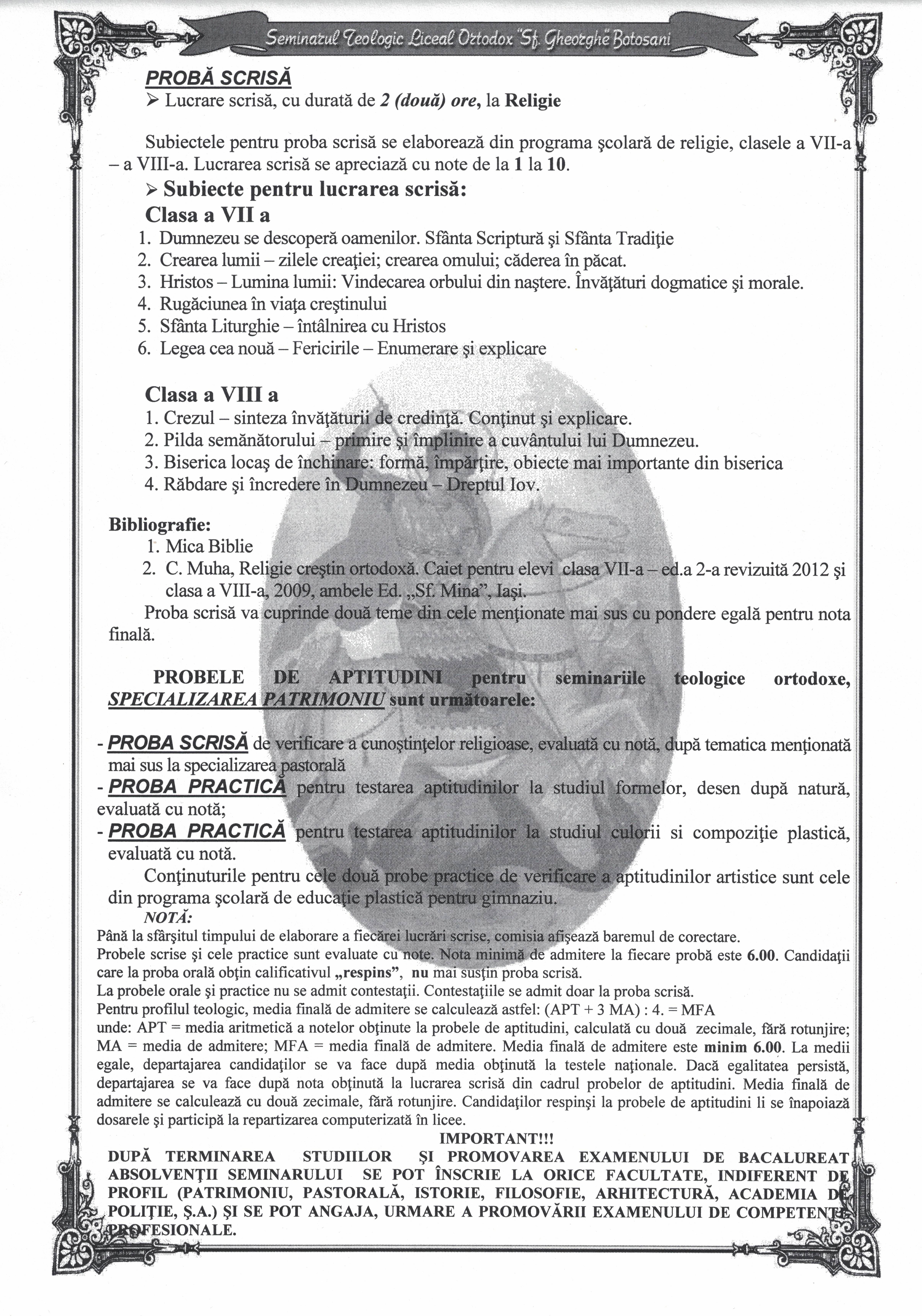 PROBELE DE APTITUDINI pentru seminariile teologice ortodoxe, SPECIALIZAREA PATRIMONIU sunt următoarele: