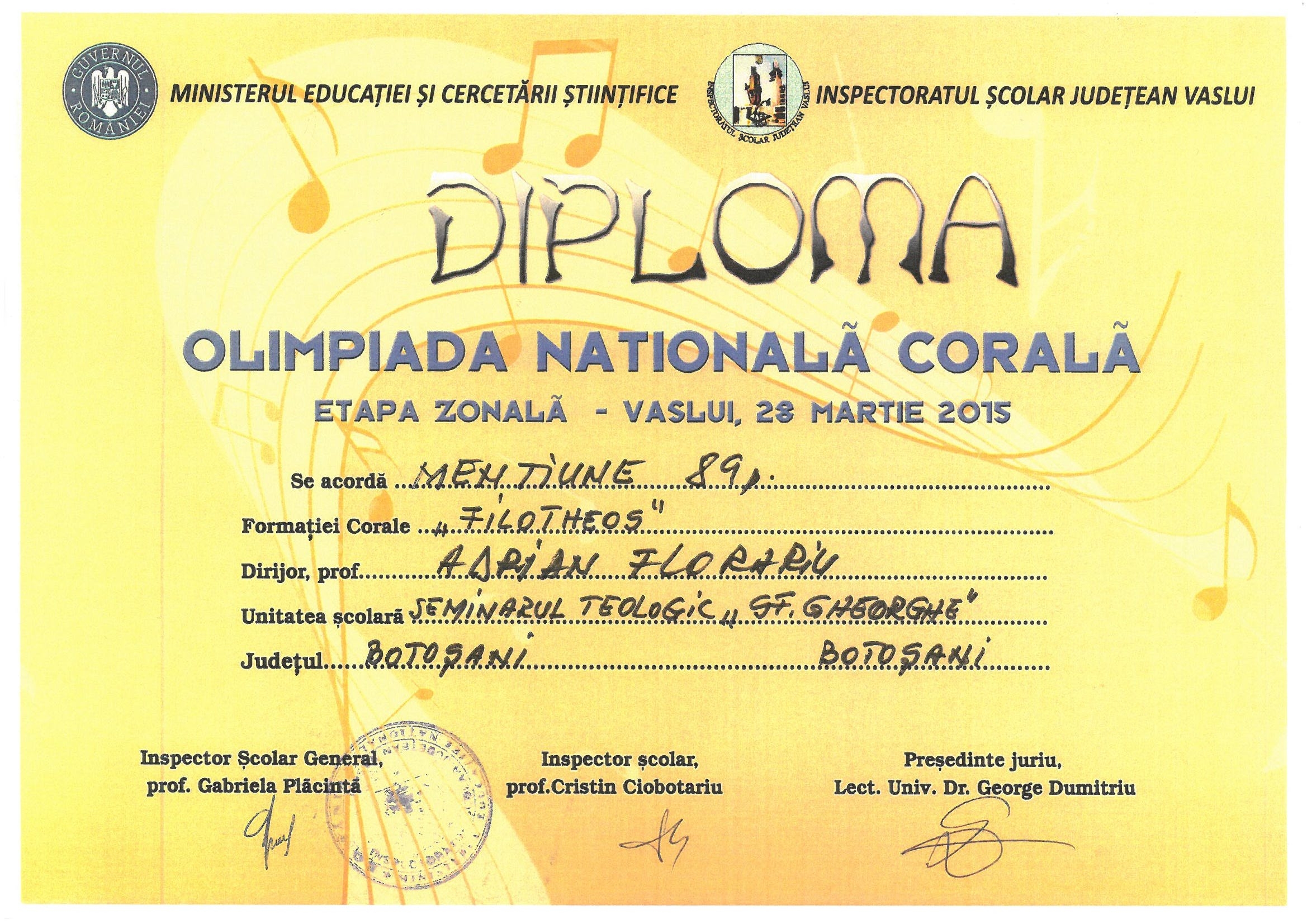 Pe data de 28 martie 2015, formaţiile „Biruitorii” şi „Filotheos” de la Seminarul Teologic Liceal Ortodox „Sf. Gheorghe” din Botoşani au participat la Olimpiada Naţională Corală, etapa zonală – Vaslui. Sub coordonarea pr. prof. Constantin Zăiceanu, corul „Biruitorii” a obţinut premiul III iar grupul coral de muzică psaltică „Filotheos”, coordonat de pr. prof. Vasile Arhip, a obţinut o menţiune.