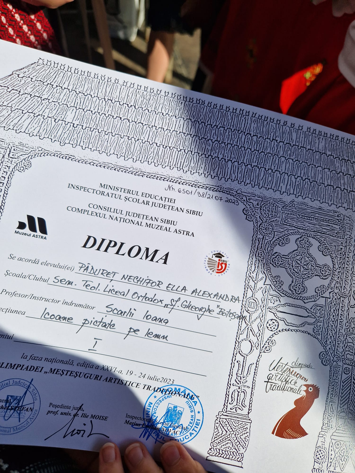 Eleva Pădureț Nechifor Ella Alexandra, din clasa a XII-a B, a obținut Premiul I în cadrul Secțiunii Icoane pictate pe lemn, Faza națională a Olimpiadei „Meşteşuguri artistice tradiţionale”, ediția a XXVI-a, Muzeul în aer liber din Dumbrava Sibiului.